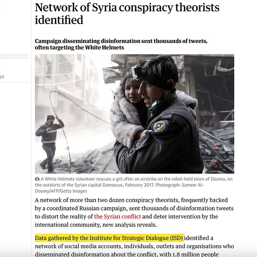 Your next clue that this is a propagandistic smear piece disguised as a news story is Townsend's sourcing. The article revolves around a report by The Syria Campaign based on information gathered by a think tank called the Institute for Strategic Dialogue. As The Grayzone's Max Blumenthal documented in 2016, The Syria Campaign is an imperial narrative management operation that is registered as a private company in the UK and has lots of shady connections and funding. The Institute for Strategic Dialogue is funded directly by the US and UK governments and a whole host of other US-aligned nations, as well as the foundations of western oligarchs like Bill Gates, Pierre Omidyar and George Soros.