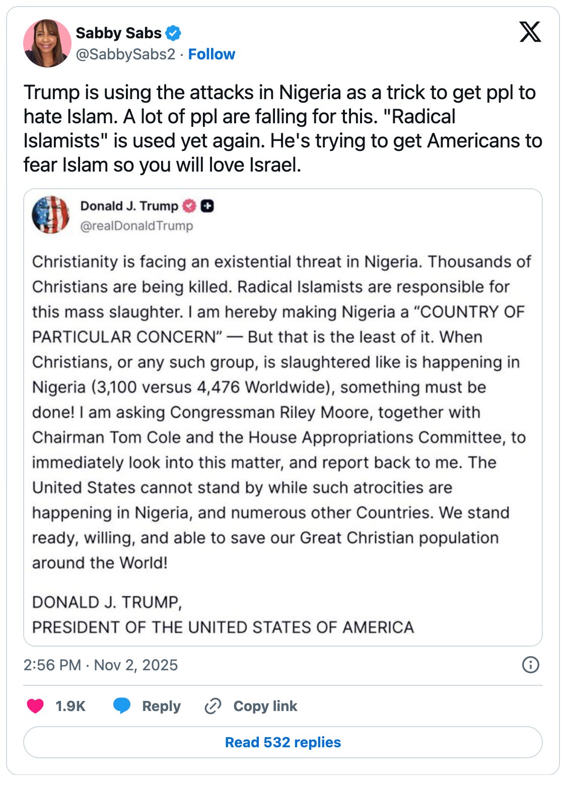 They love him, and why wouldn’t they? He bombed Iran. He bombed Yemen. He poured genocide weapons into Israel to incinerate Gaza and to bomb Lebanon, and has been aggressively stomping out free speech that is critical of Israel’s war crimes. He’s been bombing Somalia at an unprecedented rate. He’s giving every sign that he’s getting ready to do something truly horrible in Venezuela. He’s even threatening to invade Nigeria now.
