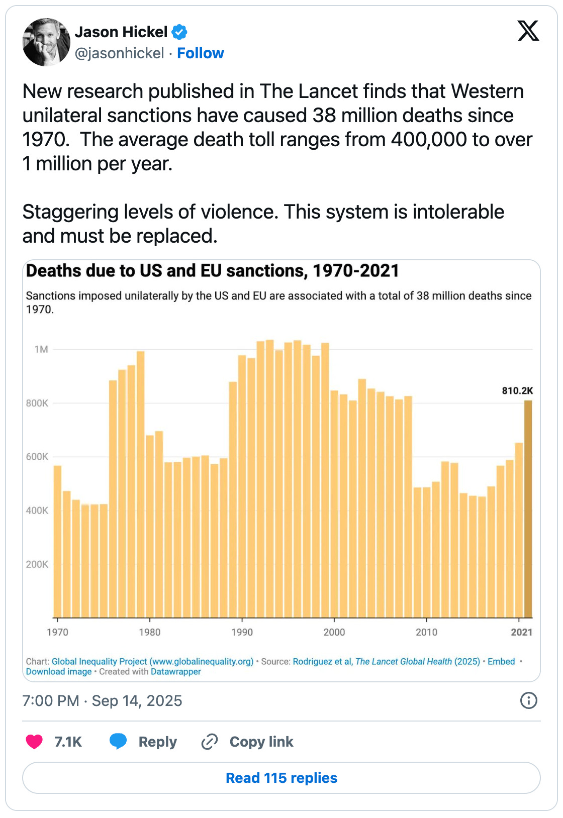 The US and its allies have killed millions of people in their wars of aggression since 9/11, and displaced tens of millions. Their cruel sanctions have killed tens of millions since 1970. Their policies of imperialist extraction force populations throughout the global south to live lives of endless poverty and toil. They are currently perpetrating a genocide in full view of the entire world.