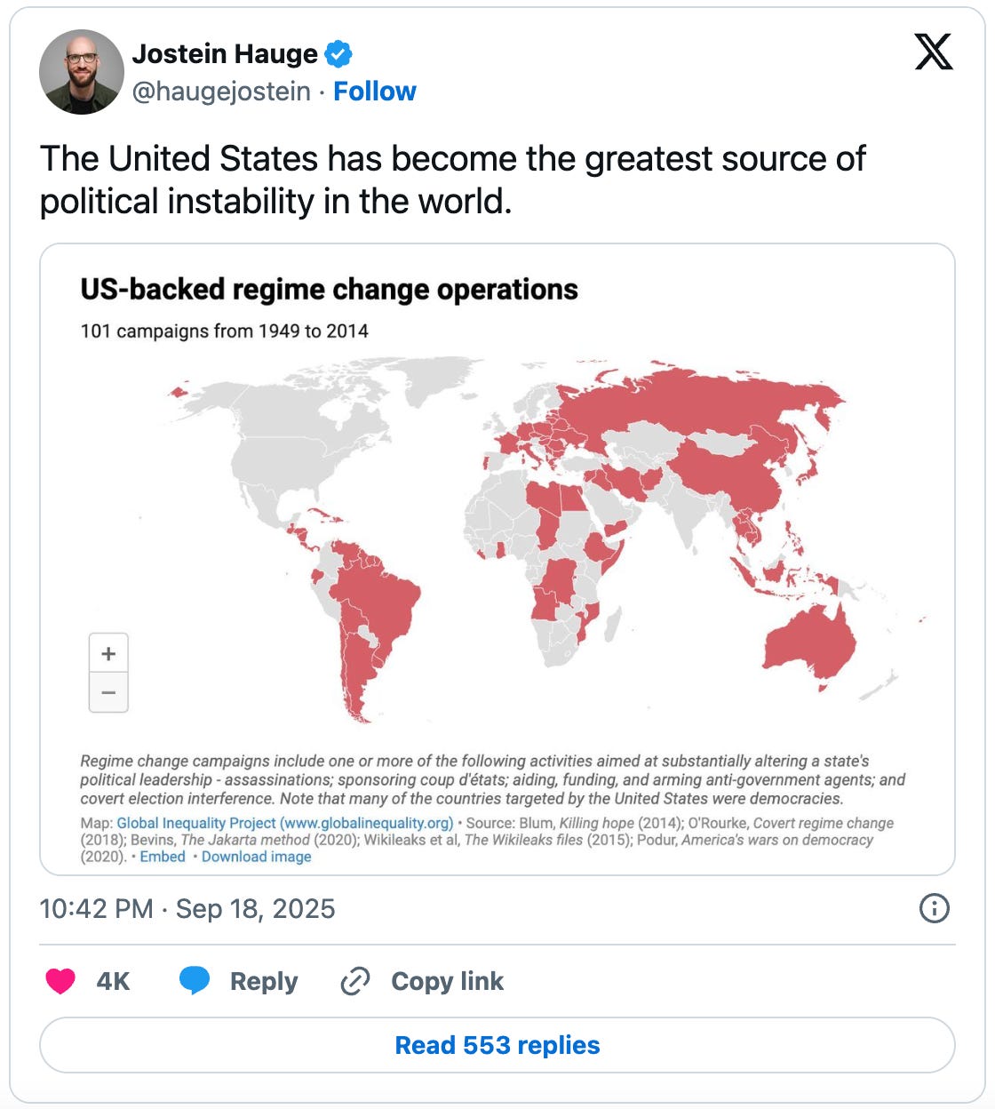 I think it’s worth remembering this as the empire harnesses the emotional hysteria around Charlie Kirk’s death to whip up a moral panic about violent radical leftists in the United States in order to justify increased authoritarian measures to stomp out political dissent. The real violence is coming from the powerful manipulators who want you consenting to these measures. The call is coming from inside the house.