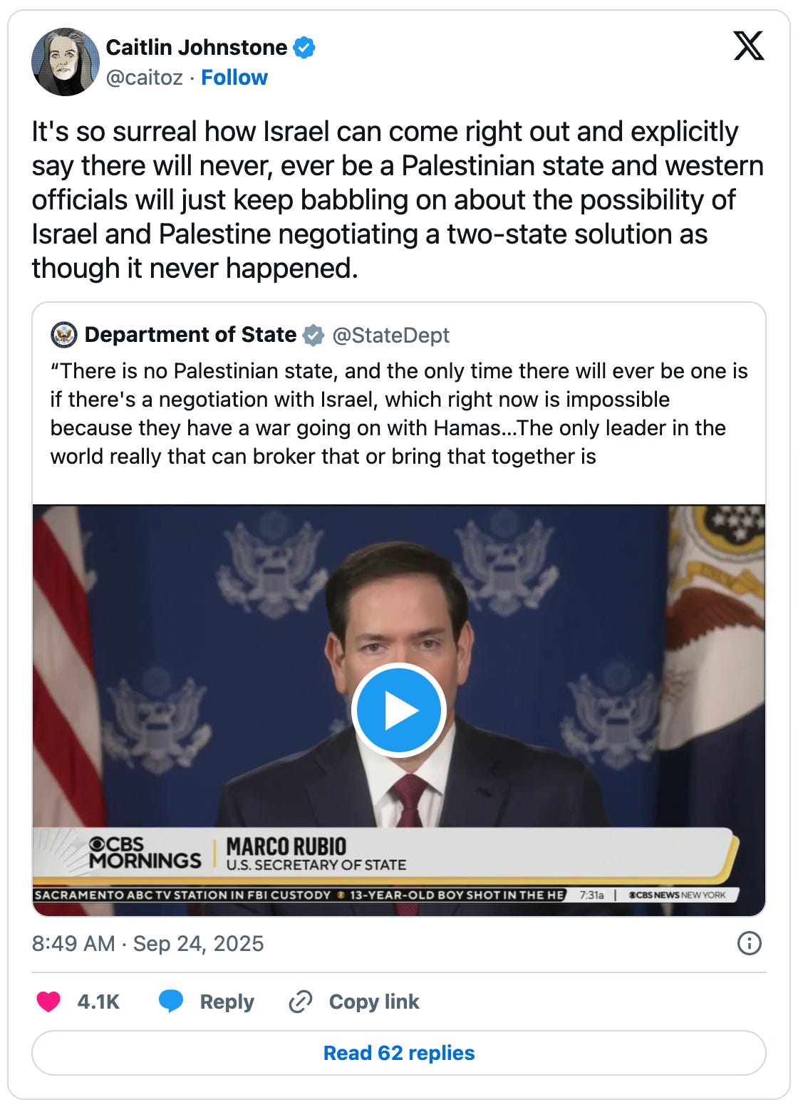 He’s spelling it out in black and white. The Bernie Sanders-style framing of the nightmare in Palestine as a Netanyahu problem which can be remedied in short order by a two-state solution is a fairy tale that western liberals tell each other so they don’t have to face the cold hard reality that the problem is the state of Israel itself.