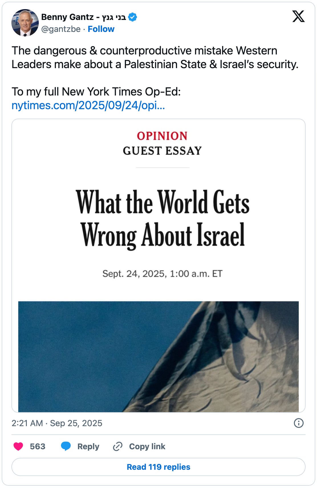 “Too often, Western leaders view our policies in this war not through the lens of national security, but through the prism of individuals — and, in particular, Israel’s prime minister, Benjamin Netanyahu,” Gantz writes. “The conversation is often framed as a question of what serves the prime minister, as if Israel’s national security begins and ends with one man. This view is mistaken and counterproductive to global stability, regional normalization and Israel’s own security.”
