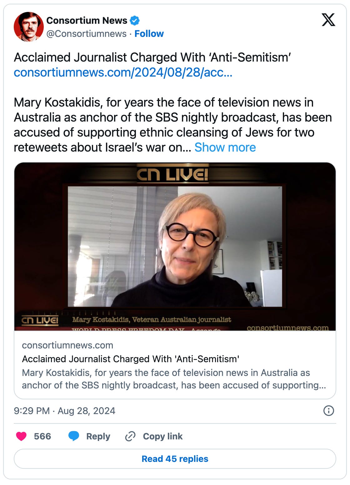 Something similar is happening in Australia, where high-profile journalist Mary Kostakidis faces charges of violating the Racial Discrimination Act for two retweets about Israel and Hezbollah which offended the Zionist Federation of Australia. This move came shortly after the Australian government appointed its first “anti-semitism envoy”, a move many feared would lead to crackdowns on speech that is critical of Israel.