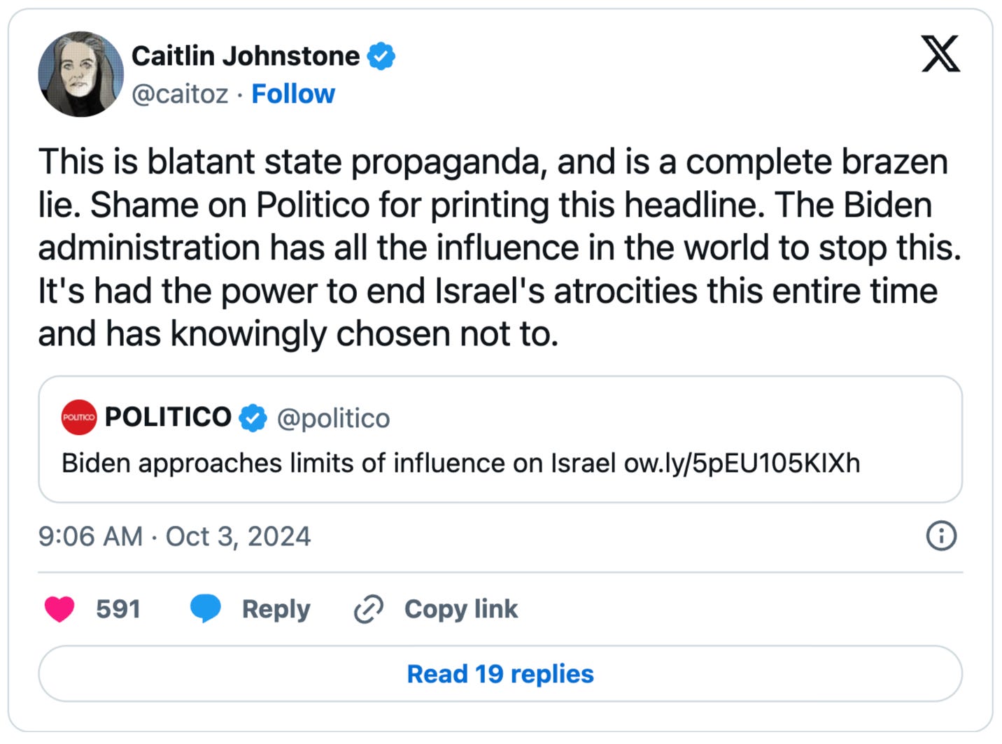 Politico has an obnoxiously propagandistic and deceitful article out titled “Biden approaches limits of influence on Israel,” yet another in the mountain of imperial media spin pieces that have come out over the last year trying to wash this administration’s hands of its criminality by portraying it as an innocent, passive witness to the US-backed atrocities and military brinkmanship we’ve been seeing in the middle east.