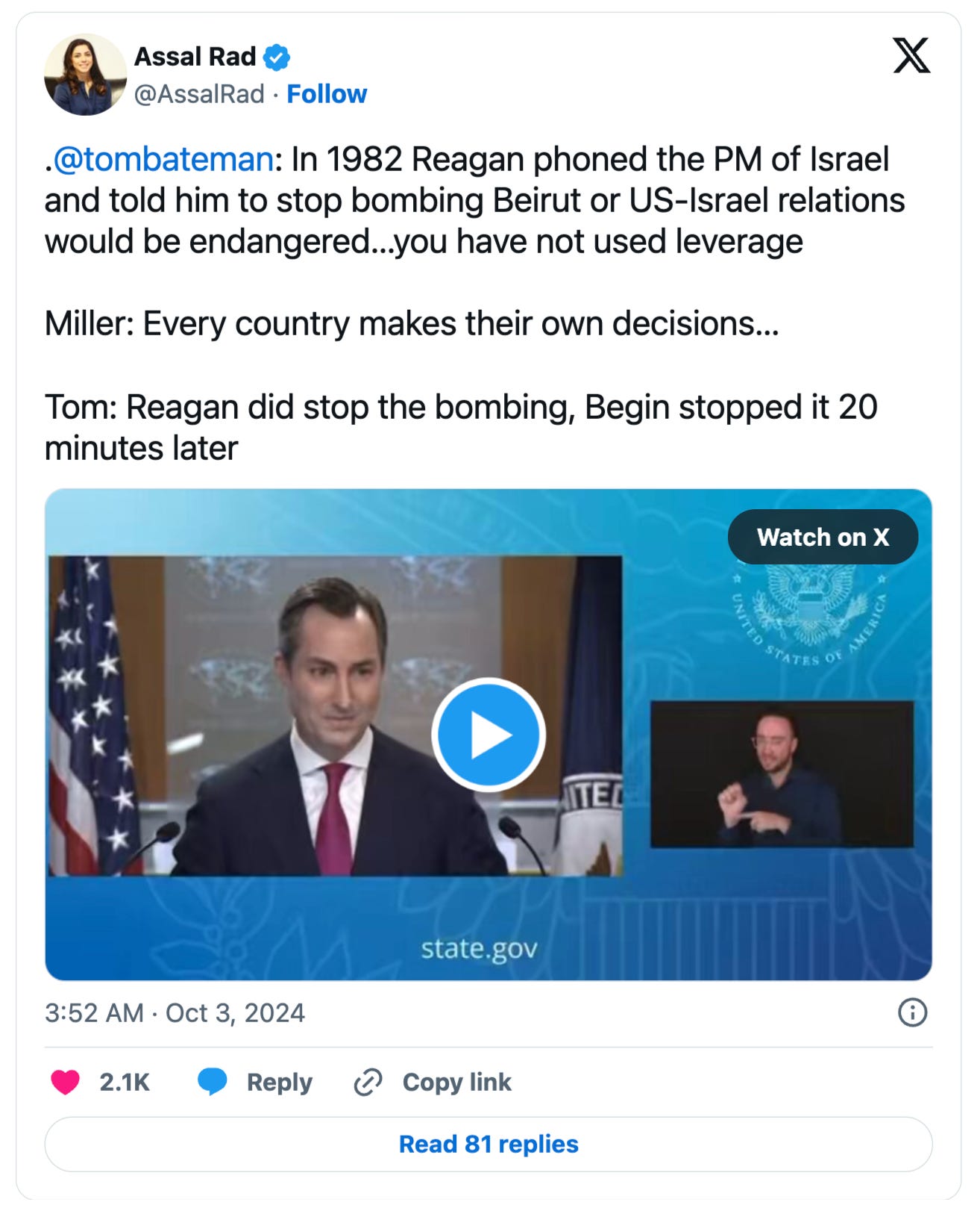 We saw this illustrated in a recent exchange at a State Department press conference. State Department Spokesman Matthew Miller was asked by reporter Tom Bateman about accusations that “you have simply not used leverage to get what you want,” citing Ronald Reagan’s well-documented phone call to the Israeli prime minister during the invasion of Lebanon in 1982 — which stopped the assault instantly.