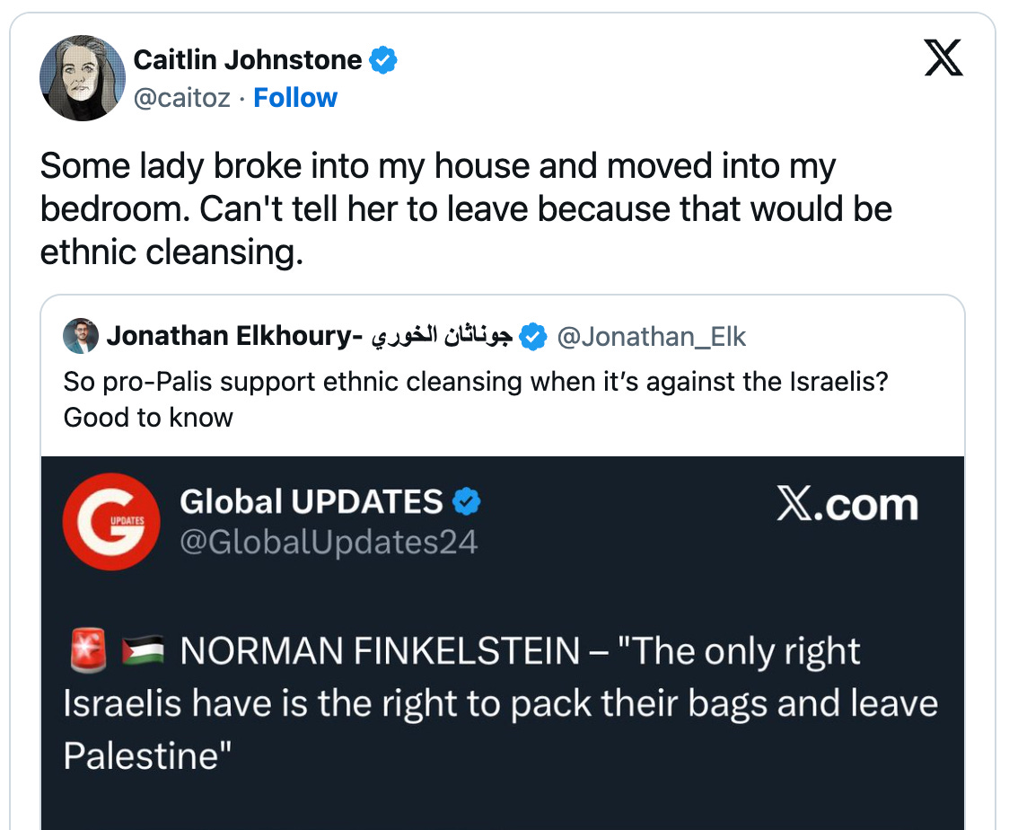 Those of us who’ve been opposing Israel’s western-backed holocaust from the beginning should want this. We should welcome it, because we care about ending this mass atrocity more than we care about feeling superior to the mainstream liberals and conservatives who are carrying this issue into the front and center of public consciousness. Moving this issue out of the political fringes and into the mainstream has always been the goal; it’s too important to gatekeep.