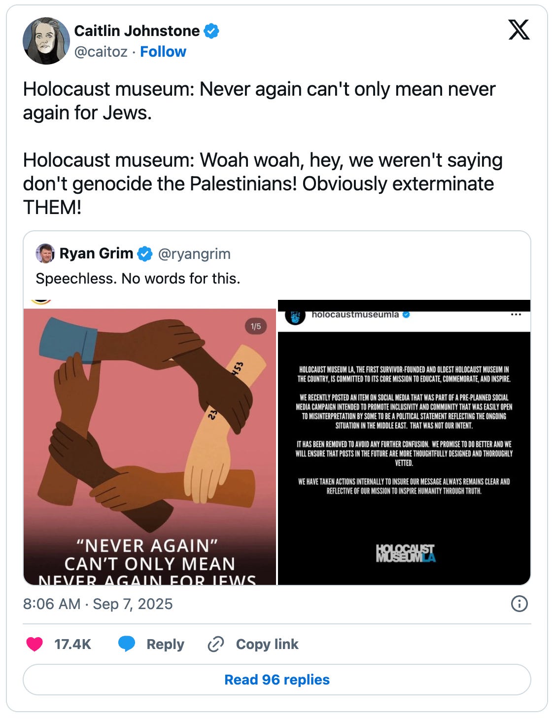 Israel supporters are so crazy and evil that the Los Angeles Holocaust Museum recently retracted a statement saying “Never again can’t only mean never again for Jews” after objections from Zionists.