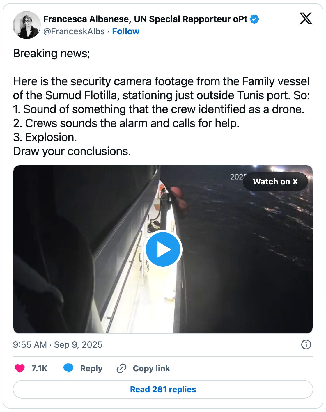 A drone appears to have struck a boat from the Global Sumud Flotilla while it was docked at a Tunisian port on its way to bring aid into Gaza, temporarily starting a fire. Nobody on board was harmed. The boat was reportedly crewed by the same activists who had attempted to sail to Gaza on the Madleen this past July, including Greta Thunberg.