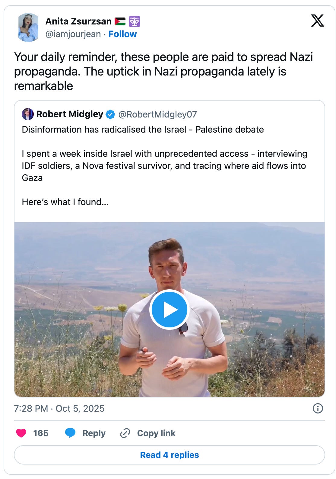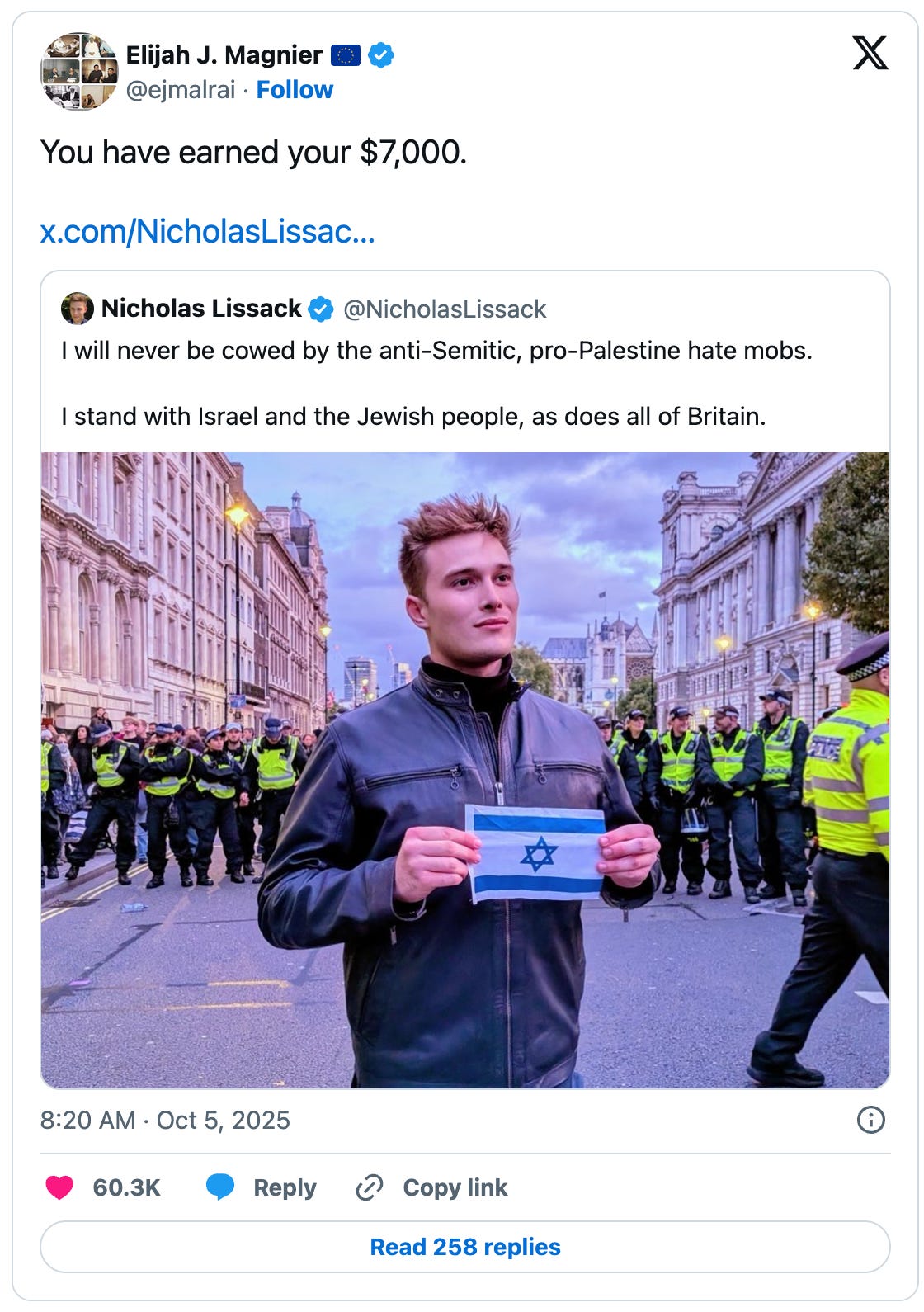 Now that everyone’s aware that Israel is paying influencers $7,000 per post to churn out propaganda on its behalf, whenever you see a video online of some young social media-savvy personality promoting pro-Israel narratives you see their replies flooded with memes and jokes about their $7k jackpot. From now on whenever some sunglasses-wearing zillennial shows up going “Israel is surrounded on all sides by Islamofascists and you think JEWS are the problem? Uhh, no babe. Walk with me,” everyone’s going to go “Found one of those $7k posts.”