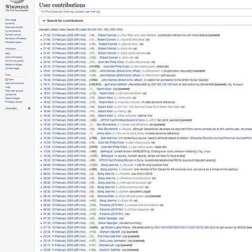 Since 2018 alternative media voices like The Canary and Media Lens have been reporting on the frenetic editing behavior of a Wikipedia account by the name of "Philip Cross" which works an inhuman number of hours without ever taking a day off, largely targeting the accounts of those who criticize the western empire and voice skepticism of its dominant narratives.