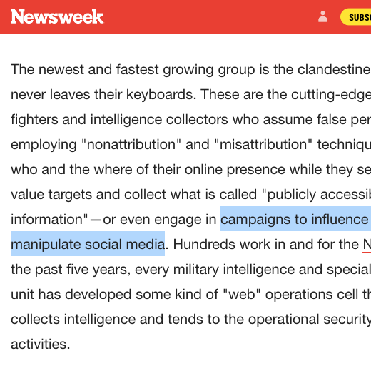 The Ukraine war is the single most aggressively trolled issue I've ever witnessed. As soon as it started, Twitter was full of brand new accounts swarming anyone who uttered wrongthink about Ukraine, and now there are entire extremely coordinated troll factions working to scare people away from criticizing empire narratives about this war. It's plainly very inorganic, so it's good to recall what we know about the trolling operations of western militaries.