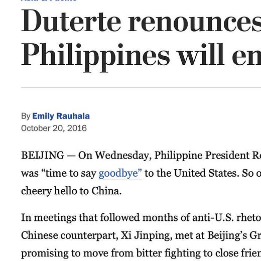 What happened, as Ames points out, is that Duterte ceased publicly toying with the notion of pivoting from Washington to Beijing as he had been doing since taking office, shifting to a hard line against China in support of Manila's longtime imperial overlord.