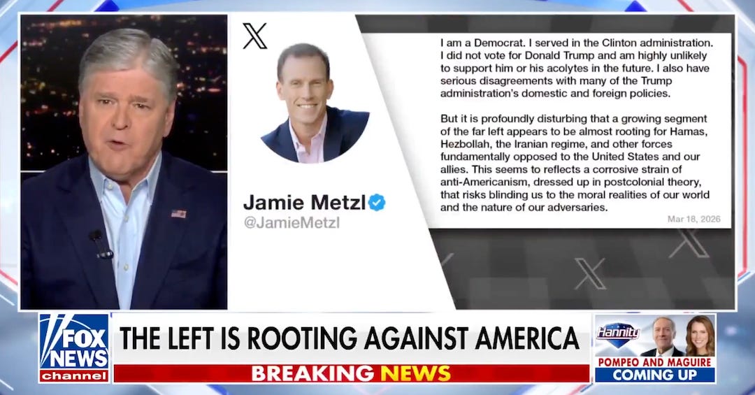 I saw a clip of Fox News war propagandist Sean Hannity solemnly reading a tweet by Atlantic Council fellow Jamie Metzl which said, “It is profoundly disturbing that a growing segment of the far left appears to be almost rooting for Hamas, Hezbollah, the Iranian regime, and other forces fundamentally opposed to the US and our allies. This seems to reflect a corrosive strain of anti-Americanism dressed up in post-colonial theory that risks blinding us to the moral realities of our world and the nature of our adversaries.”