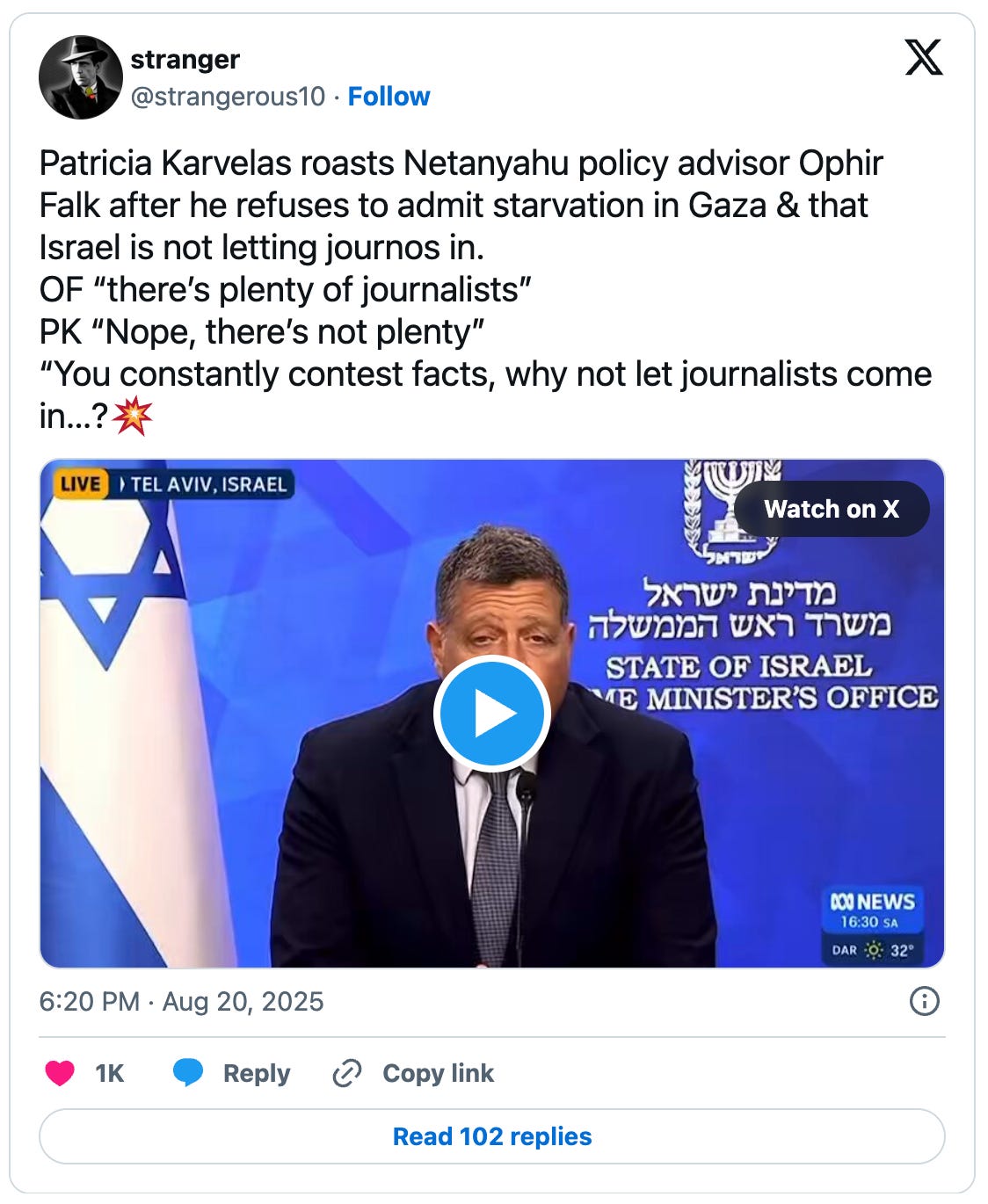 I saw a clip of ABC host Patricia Karvelas raking Netanyahu policy advisor Ophir Falk over the coals for his denialism of Israel’s atrocities in Gaza, and the thought occurred to me that Israel really has lost the normies. All the mainstream western empire loyalists who dutifully toe the imperial line under normal circumstances are dropping away, one by one.